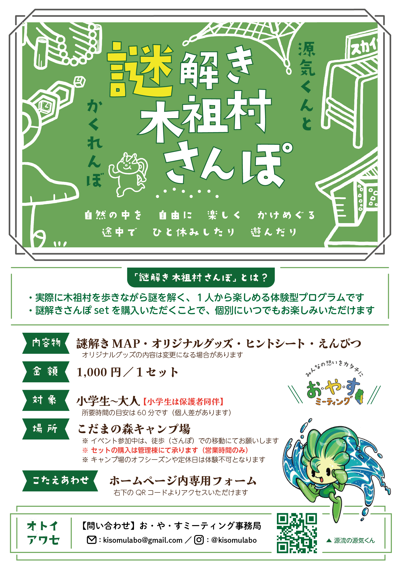 さらに、好評だった謎解きイベント「謎解き木祖村さんぽ~源気くんとかくれとかくれんぼ~こだまの森編」も景品付きで体験できます!謎解きしに来てね!